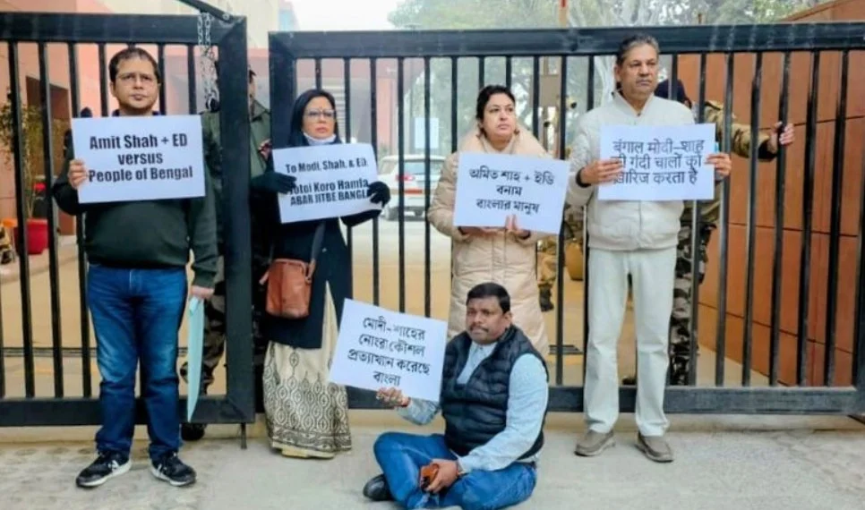 “First, the misuse of the ED, and now an attack on the peaceful dharna of our MPs,” the party said. “You may try to choke democracy, but Bengal will not be cowed.”
