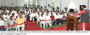 Chandigarh, August 6 – Haryana Chief Minister, Sh. Nayab Singh Saini while making a series of pivotal announcements for Arthiyas (commission agents, a link between farmers and buyers of their produce) here today said that the Arthiyas will get an increase of 20 percent for paddy, which means that commission amount has been increased from Rs. 45.88 to Rs. 55.00 per quintal, which is maximum in any state. He said that the government would compensate for the losses incurred by Arthiyas due to wheat shortages. For this, he announced compensation of approximately Rs. 12 crores.