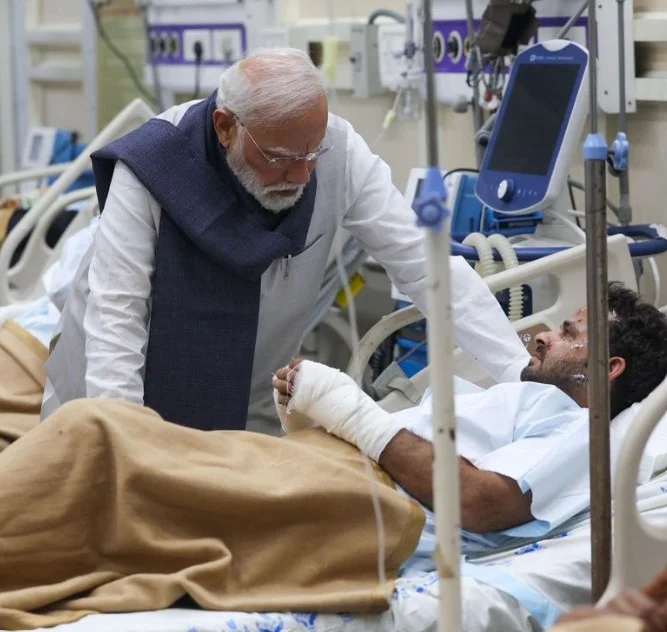 New Delhi, November 12: Returning from Bhutan, Prime Minister Narendra Modi wasted no time before heading straight to the Lok Nayak Jai Prakash (LNJP) Hospital to meet the victims of Monday’s car explosion near the Red Fort, which killed ten people and injured twenty.