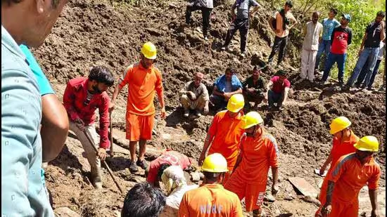 The victims included Tripta Devi, her son Chunni Lal, daughter-in-law Anjana Kumari, and grandchildren Bhopesh, 5, and Jagriti, 7. The family belonged to Shiv Ram, who survived because he was resting in the veranda at the time. “It all happened within moments,” said Bhoga Ram, the gram panchayat pradhan, adding that Shiv Ram’s brother Dharam Das and his wife Kala Devi were also injured and admitted to hospital. Their son was away when the landslide struck.