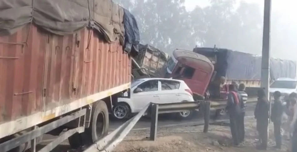 The pile-up occurred near Doraha when a truck transporting LPG cylinders braked suddenly after a car slowed down ahead of it, leading to a series of rear-end collisions amid poor visibility.