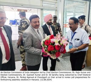 An Election Commission of India delegation led by Chief Election Commissioner, Sh. Rajiv Kumar and Election Commissioners, Sh. Gyanesh Kumar and Dr. SS Sandhu arrived at Chandigarh today to review poll preparedness for forthcoming assembly elections in Haryana. Chief Electoral Officer, Haryana, Sh. Pankaj Agarwal and other officer are also seen in the picture. (12.08.2024)