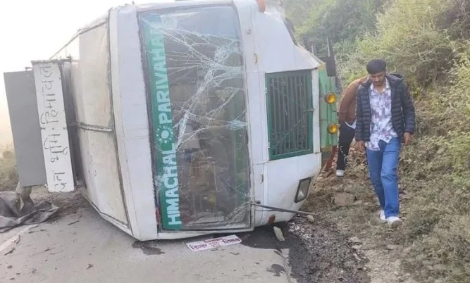 Rajgarh, Himachal Pradesh, Sept. 30 – A Himachal Road Transport Corporation (HRTC) bus traveling from Dibber to Shimla overturned on the Sanora–Neripul–Chaila road in Rajgarh subdivision on Tuesday morning after a technical fault, but a disaster was narrowly avoided thanks to the driver’s quick thinking.