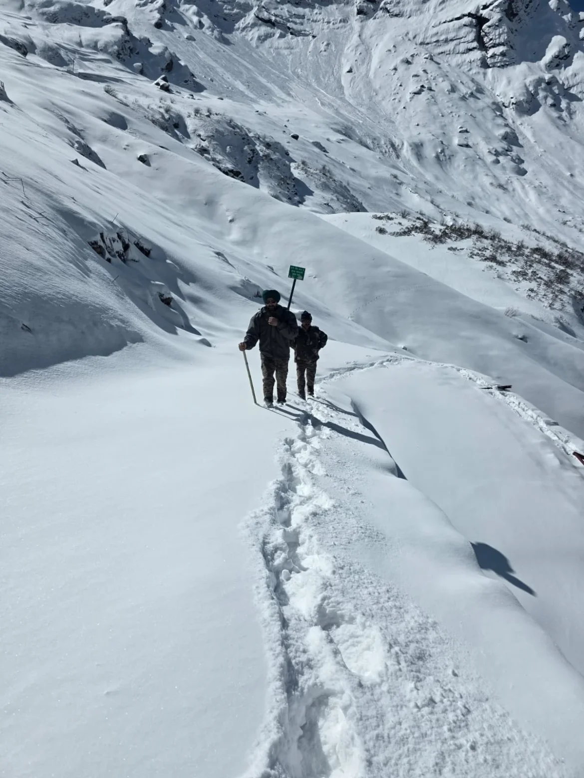 Hemkund Sahib, Uttarakhand, April 5: A joint team of Indian Army personnel and Gurudwara Sri Hemkund Sahib Management Trust sevadars evaluated the high-altitude trek from Govindghat to Sri Hemkund Sahib on April 5. The reconnaissance mission identified several critical points along the route, including the Atlakoti Glacier, where heavy snow remains a challenge for pedestrian movement.