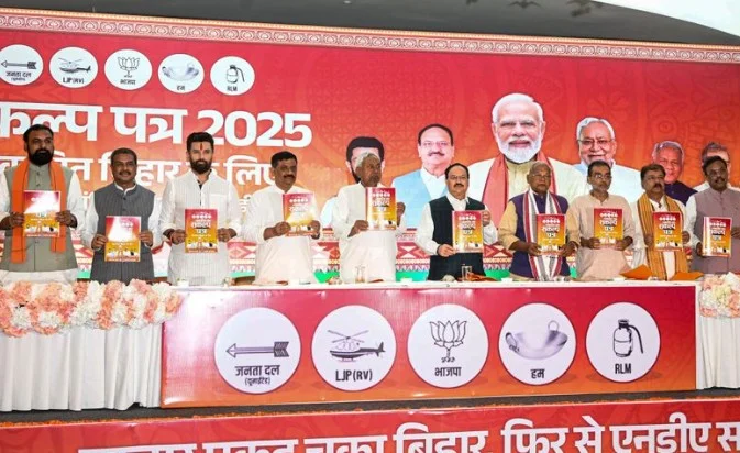 Patna, October 31 — Promising to reshape Bihar’s growth story, the National Democratic Alliance (NDA) on Friday released its manifesto for the upcoming assembly elections, announcing employment schemes, urban infrastructure upgrades, and sweeping social welfare commitments.