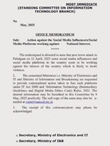 New Delhi, May 5 — In the wake of the recent terror attack in Pahalgam on April 22, a Parliamentary Standing Committee has flagged concerns over social media influencers and platforms allegedly working against the national interest, which could incite violence.