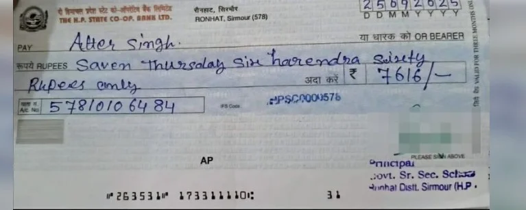 Sirmaur, Himachal Pradesh, September 29– A cheque signed by the principal of Government Senior Secondary School, Ronhat, has gone viral for all the wrong reasons, exposing the gaps in English proficiency within the state’s education system.