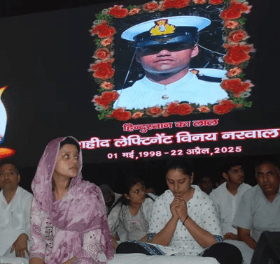 KARNAL, May 4:— Grief ran deep at Dr Mangalsen Auditorium on Saturday as hundreds of mourners paid their final respects to Lt Vinay Narwal, the naval officer killed in the recent terror attack in Pahalgam.